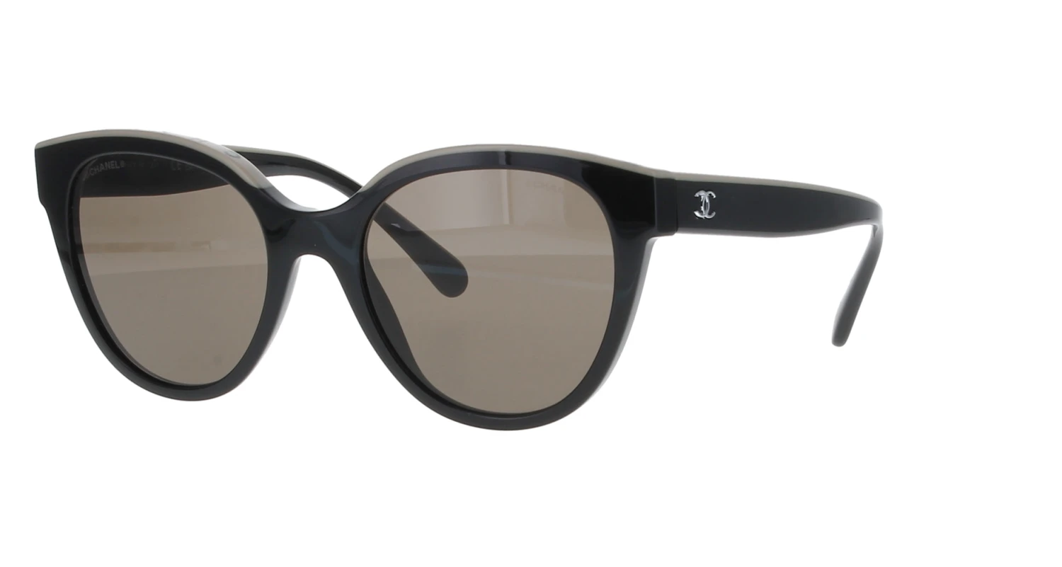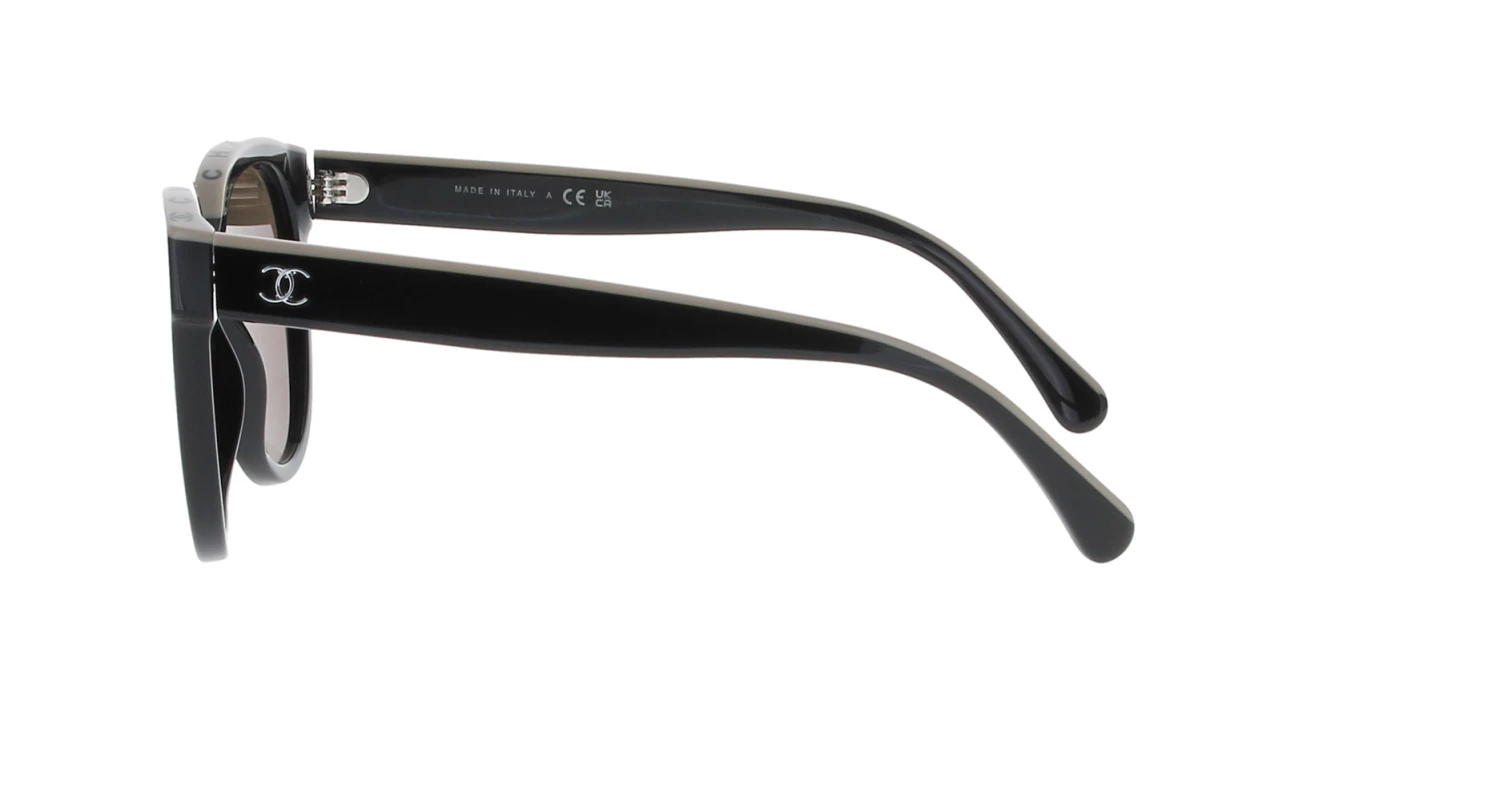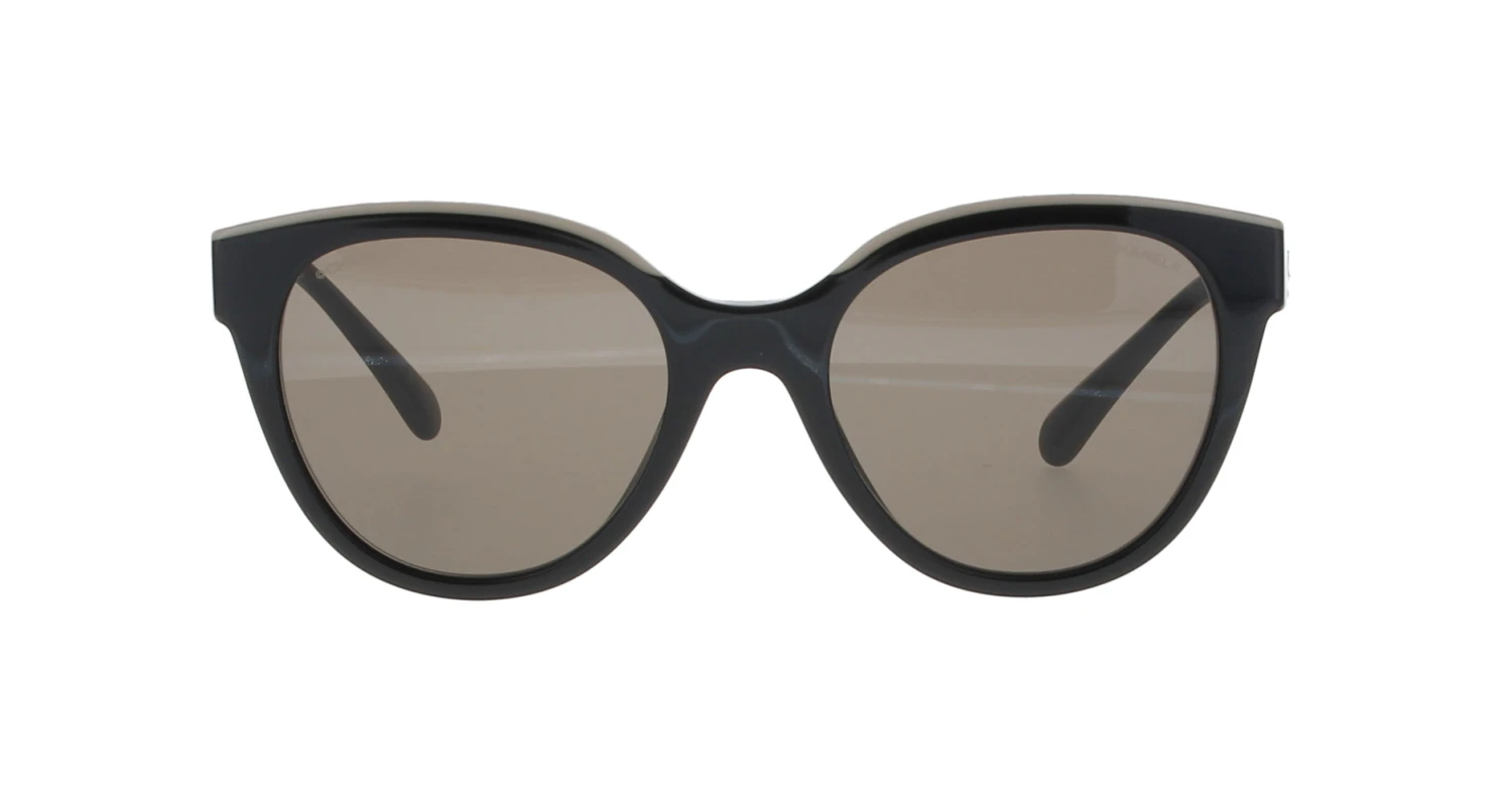 Black sunglasses with a beige top bearing the Chanel branding. These sunglases come with brown lenses and feature the iconic Chanel logo to both temples. Current Chanel collection