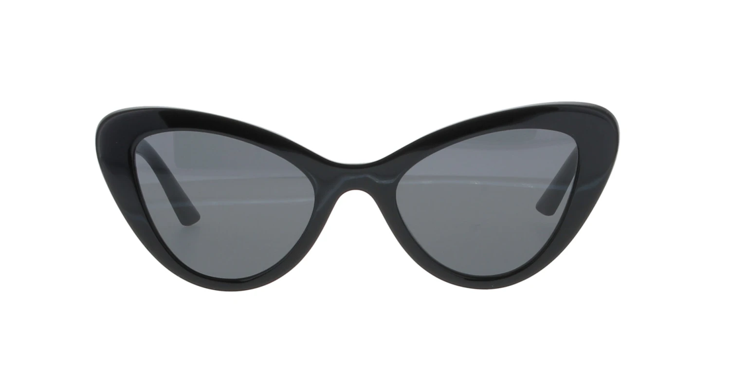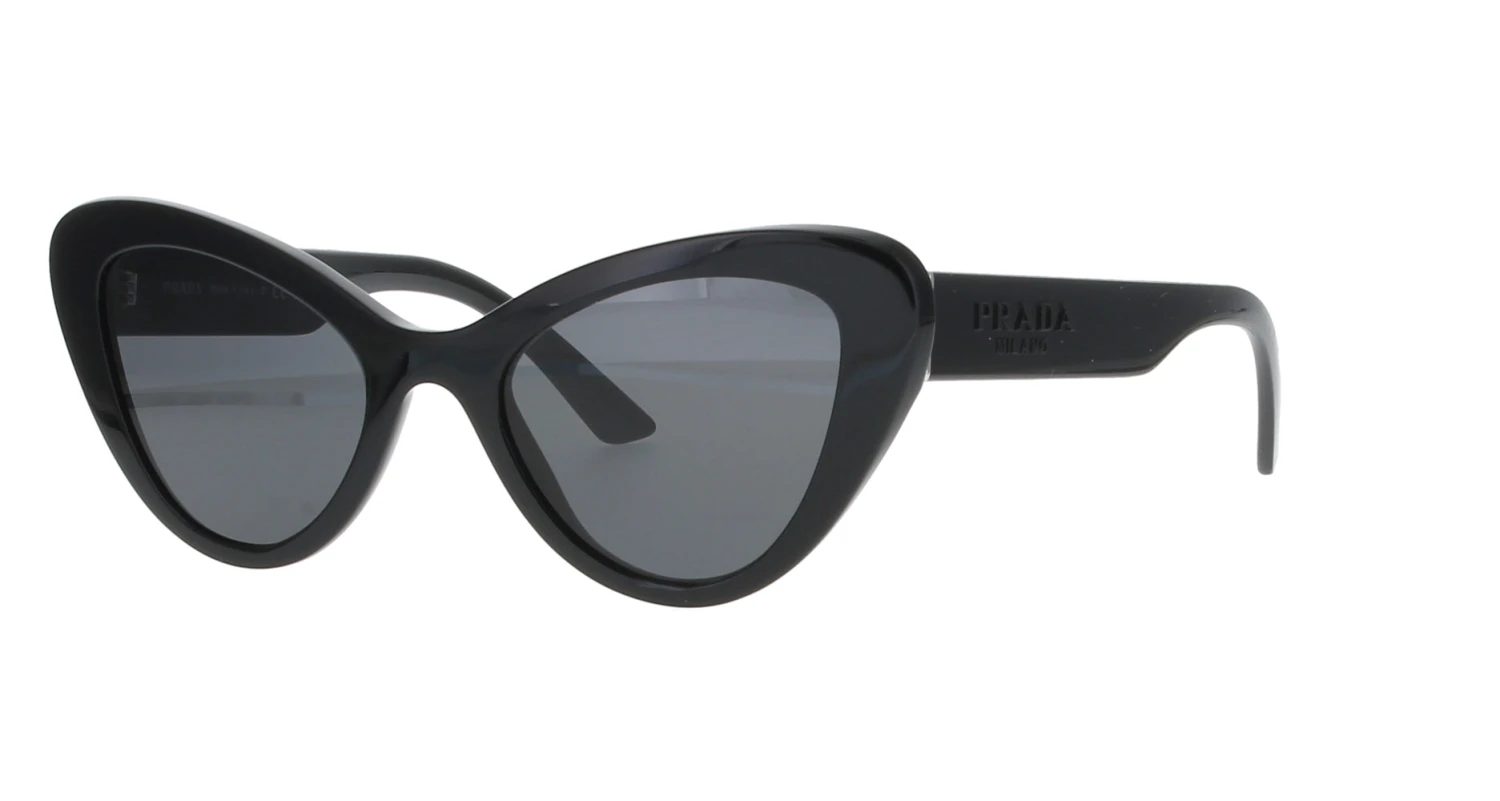 A shiny black frame with dark grey lenses. The temples feature the Prada branding in black