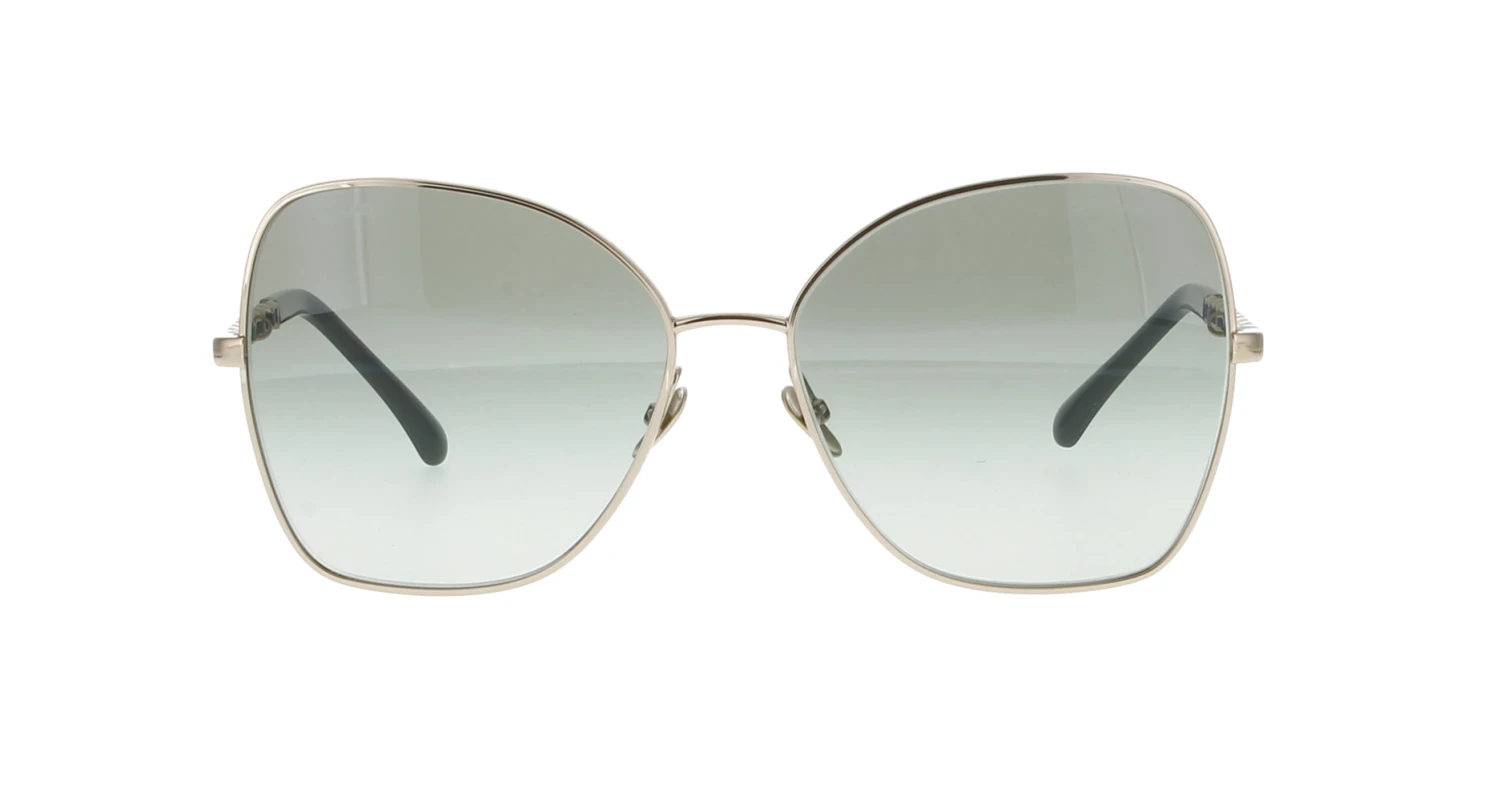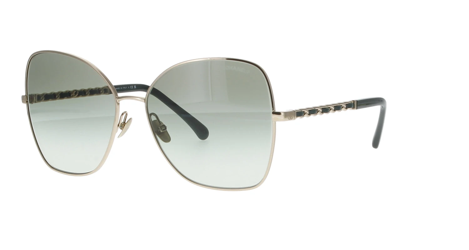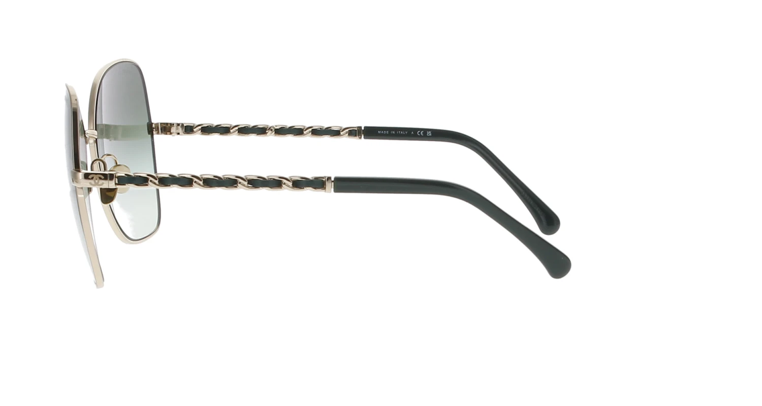 A gold frame with dark green calfskin to temples. Gradient green lenses. Current Chanel Collection. Note, these sunglases do not come with a long chain