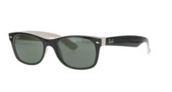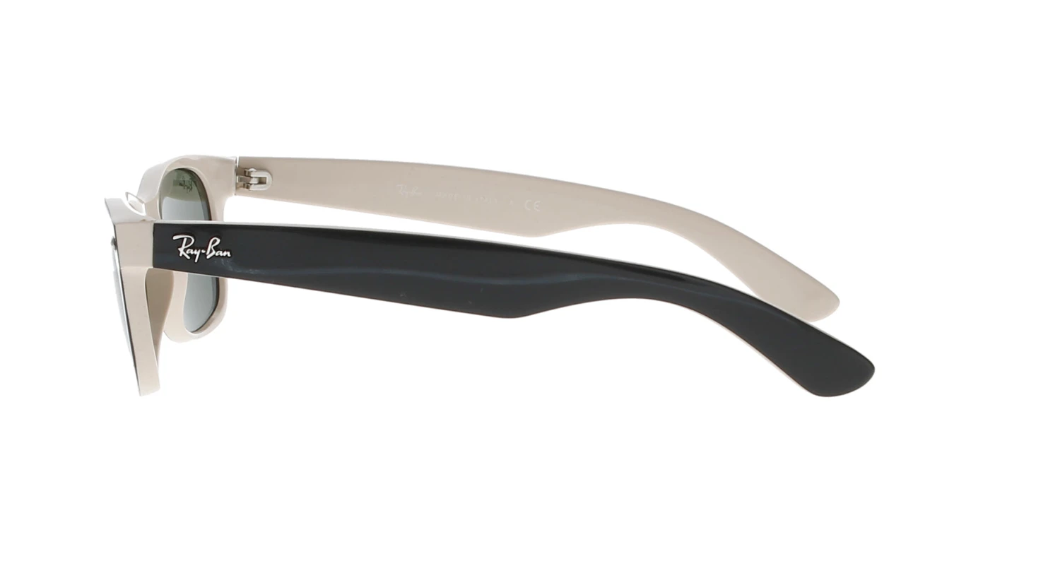 These sunglasses come in a top black on beige frame. The wide temples carry the Rayban logo in silver. Crystal green lenses