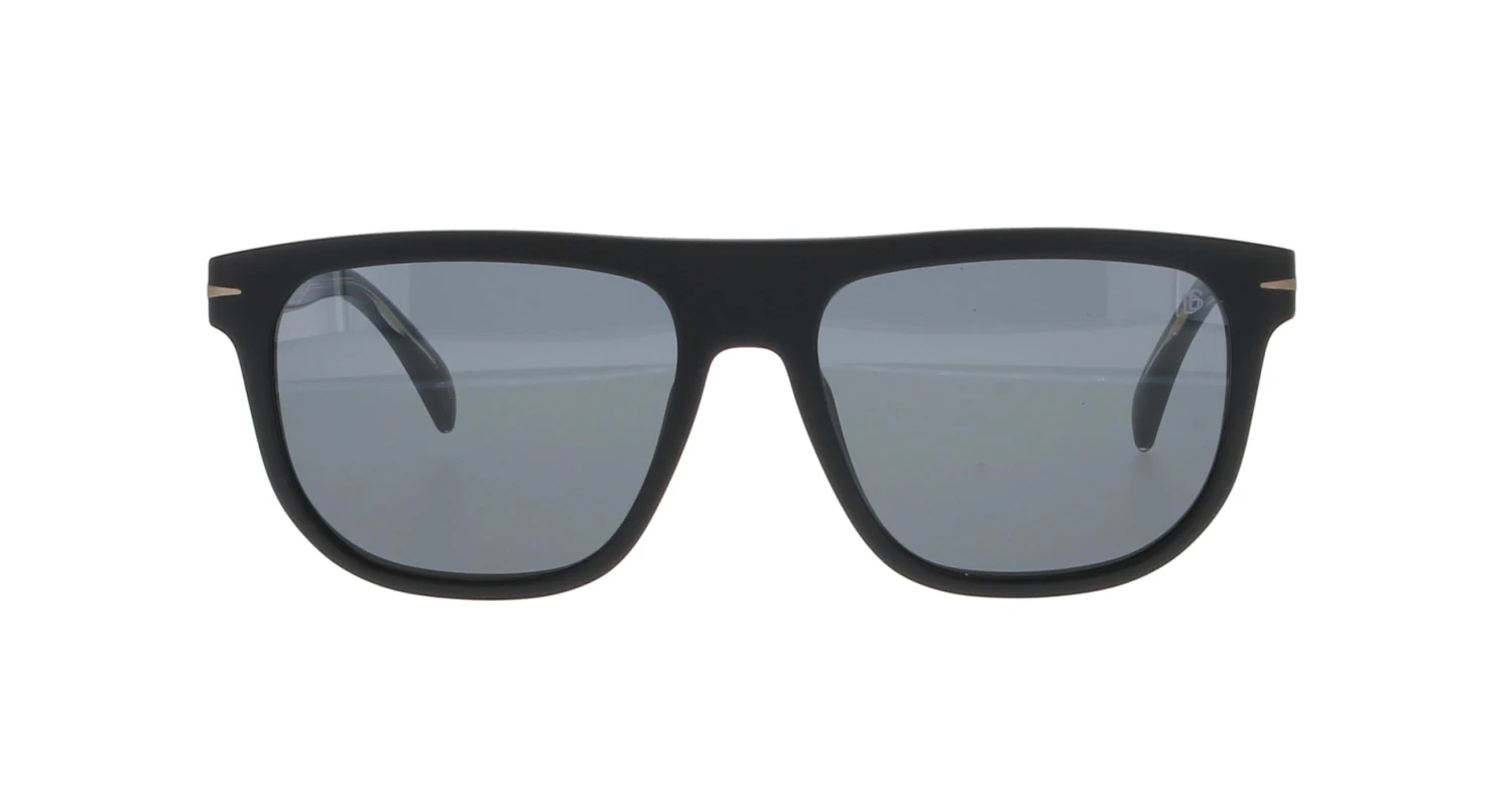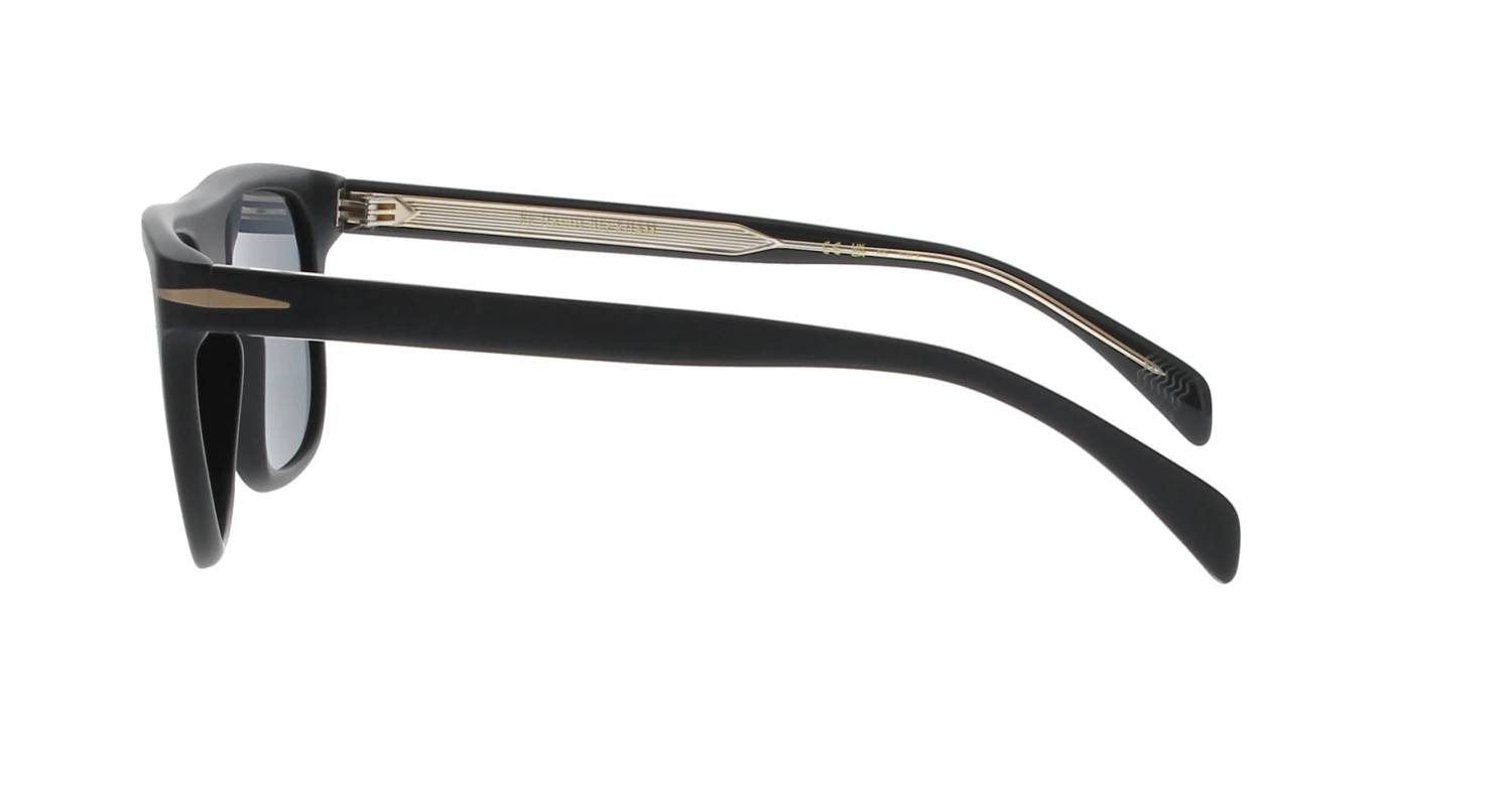 A matt black straight-top frame with grey lenses. This frame features the subtle DB branding with the monogram on one end tip